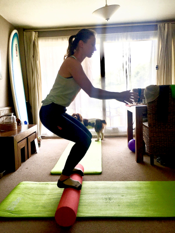 Balance. As the roller moves a little it creates a situation in which we practice stability via mobility and that replicates the balance skills needed for riding. Standing on the floor is not quite cutting to the chase.